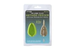 Drennan In-Line Flat Method Feeder has both the lead in the flat base and the bait load of the Drennan flat bed feeder bias the weight into an aerodynamic bomb shape. improving casting distance and accuracy. The two ribs at the front of the feeder are spaced apart to provide an area for placing the bait. without fear of it being trapped between them. This area also aligns with a recess in the mould for perfect positioning every time. Used in conjunction with the easy release bait mould you can achieve perfectly shaped groundbait or pellet mouldings every time. The special loop to loop connector provided allows quick change of the hooklink.