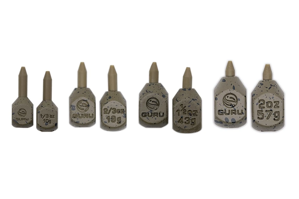 The in-line leads come complete with a soft insert as standard, which, when removed, can be replaced with the Guru X-Safe elasticated insert to totally revolutionise bomb fishing. The soft rubber inserts will simply push out and the Guru elasticated X-Safe insert will slide right back in and the “D”shaped base will lock flush with the base of the lead. They can then be quickly attached using a simple loop method which can be then secured with a tail rubber. Safe system and fish friendly. Anti-tangle. Quick change. Elasticated system cushions the hook hold in the fishes mouth. (Not included). Available in 4 sizes: 2/3oz – (19gms) 1.1oz – (31gms) 1.5oz – (43gms) 2oz – (57gms)