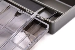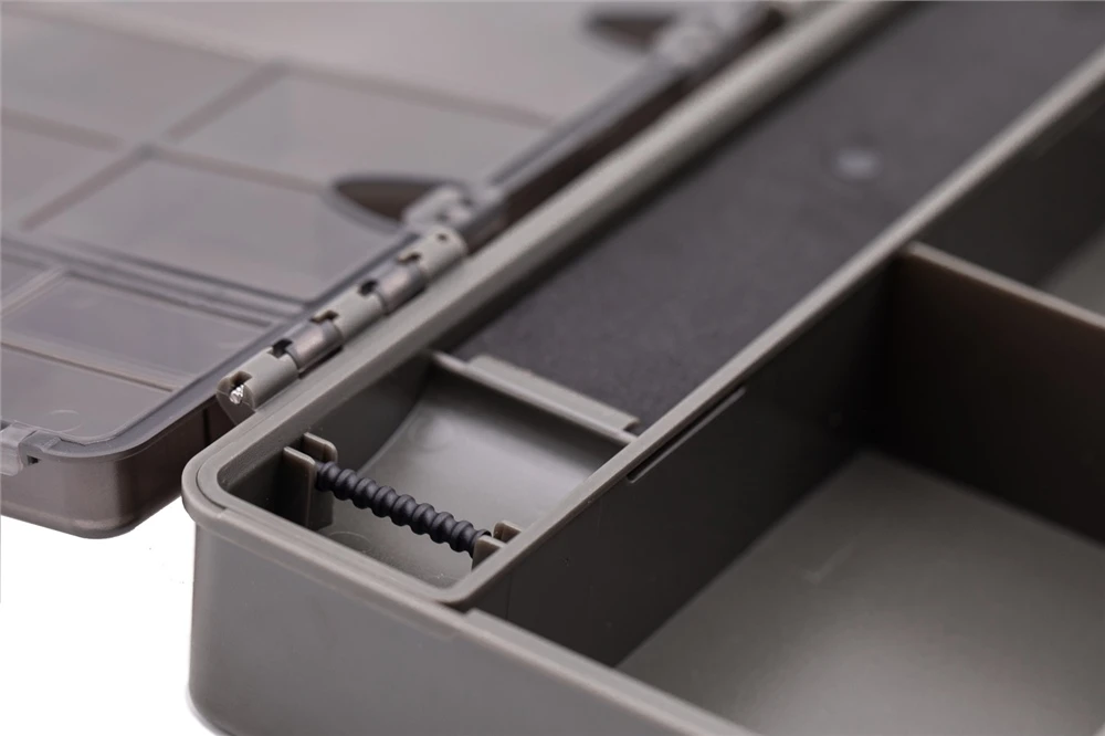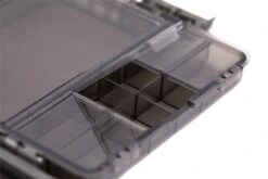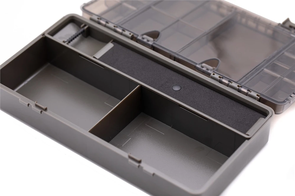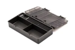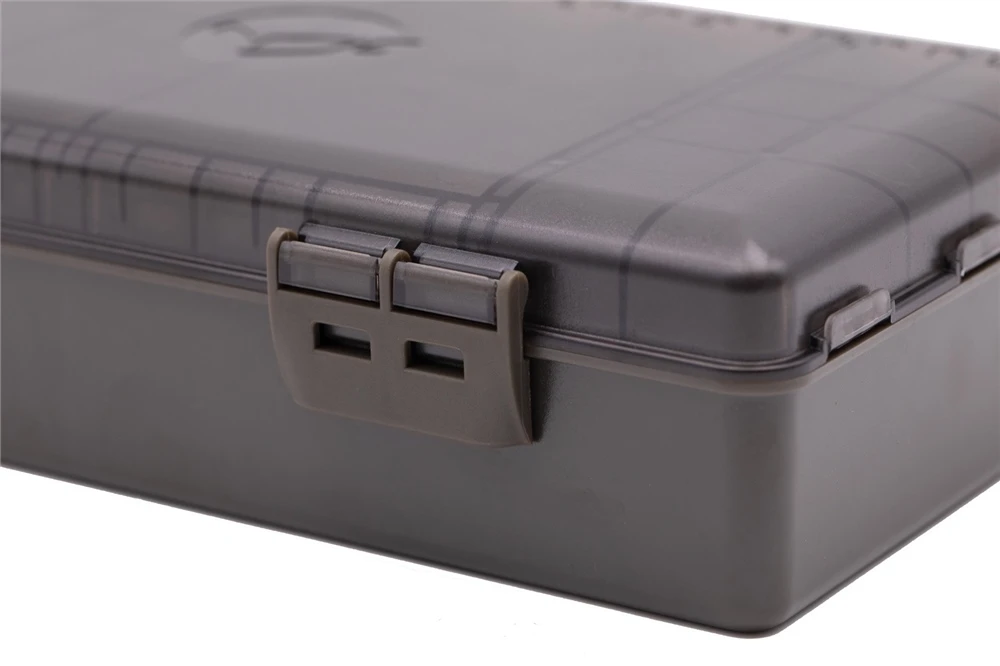The BASIXTackle Box has been designed to offer plenty of storage space for all your rig bits, whilst making it easy to organise and find them when you need to. It is made from shockproof, high impact plastic, with a translucent lid to enable you to see inside. Thelid features a ruler to enable you to accurately measure your rigsand is fastened via two latch closures to prevent any chance of it coming open during transit. Inside the lid of the BASIX Tackle Box are 21 small latched compartmentsof various sizes, which are perfect for storing items such as lead clips and swivels. Inside the box there are two large compartments, with fixed dividers, which are perfect for rig tools, hook link spools and the like. It also features a removeable rig tray, complete with pins, which can be used to store up to eight pre-tied rigs (such as the BASIX Ready TiedHair Rigs), and under this is another long storage compartment.