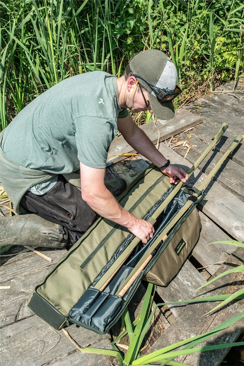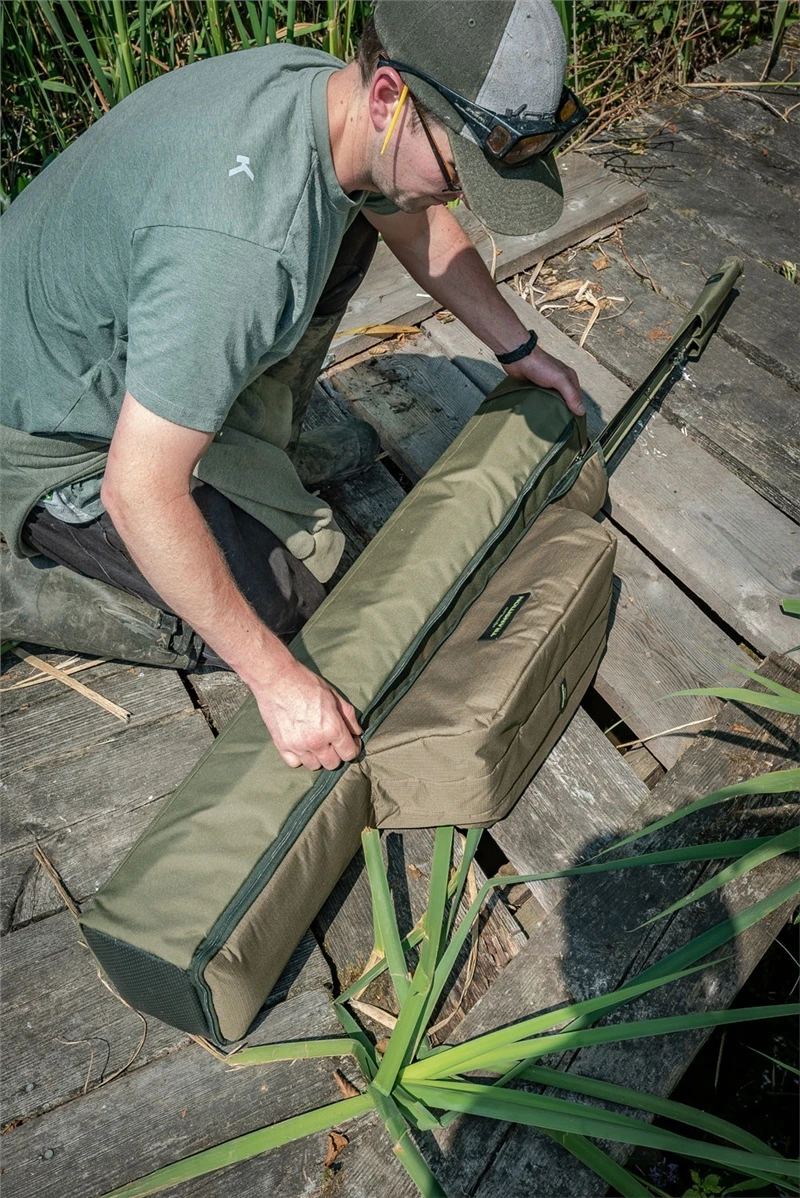 A totally new concept in rod quiver, providing an innovative new way to carry your loaded rods and reels, alongside your shelters, brollies and bankware. The compartment for your rods hinges away from the rear shelter compartment, providing all the benefits of a quiver with added rod protection. Has a generous padded area designed to house three rods and reels, plus a large rear compartment that fits all Korum shelters and brollies inside. Also features a simple outer pocket for nets, net handles or banksticks.