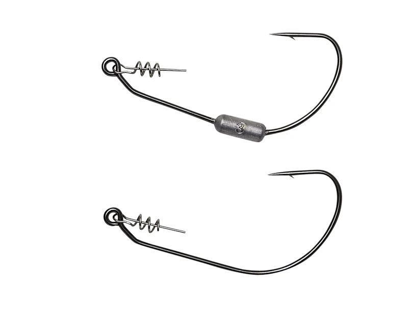 Perfect medium gape, forged Carbon steel hooks, with easy clip on large eye and mounted stainless steel centerpin corkscrew. Ultra-sharp needle point with micro barb.