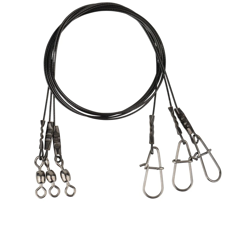 Ultra-strong 7 strand stainless steel wire, coated with a strong black copolymer, for superb abrasion resistance! Perfect sized swivel and spring steel needle snap, for hard or soft lures! The perfect pike trace!